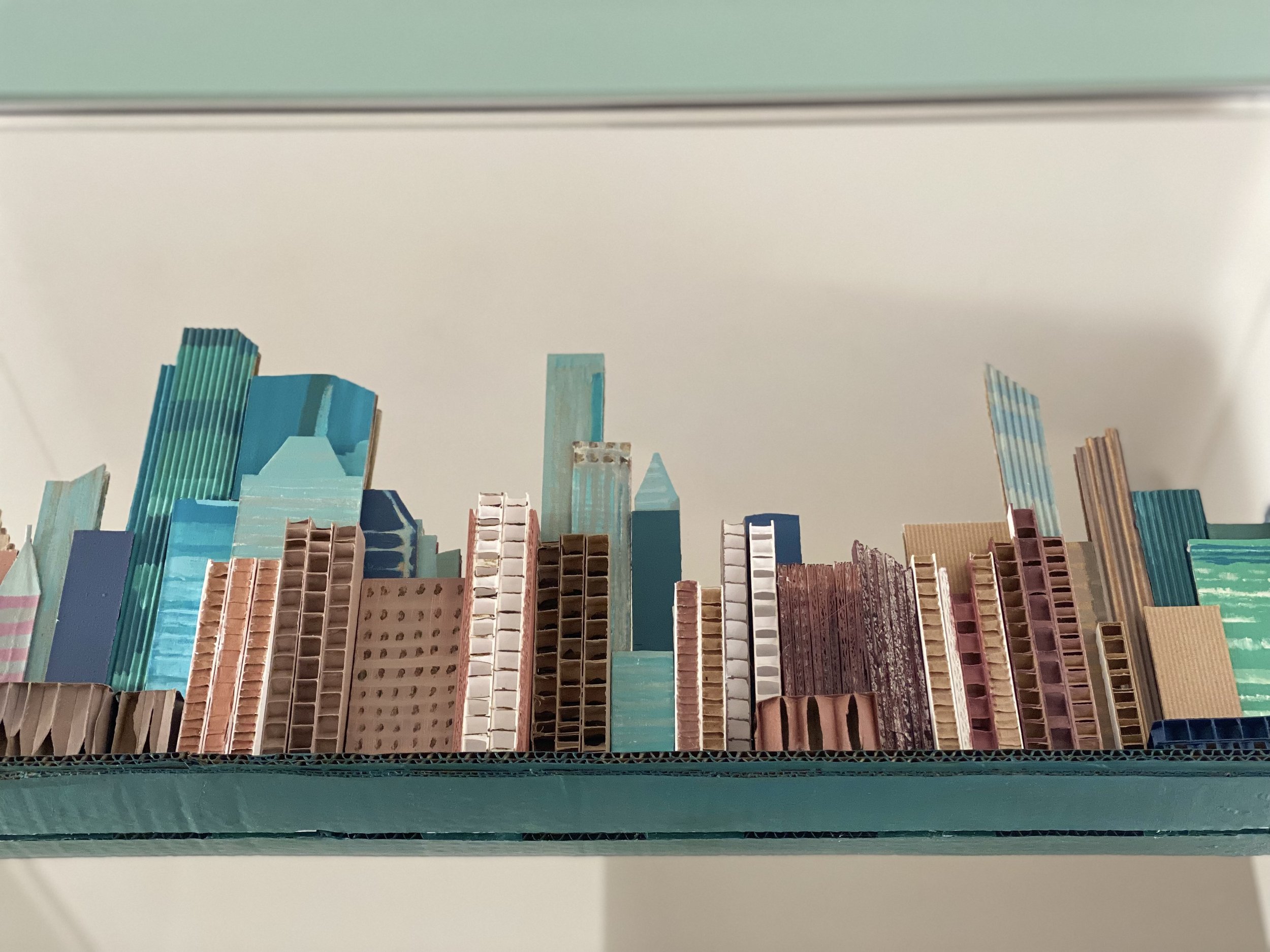 Auf einem schönen (leeren) Spiegel wollte ich New York abbilden. Dabei haben sich Displaykartons (von Kohlschein - herzlichen Dank!) als wunderbare architektonische Baukörper erwiesen. Auch der alte Weinkarton wurde zurechtgestutzt, bemalt und reaktiviert. Und aus IKEA-Verpackungsmaterial entstanden einstöckige Hallen. Danke Karen - einmal mehr - für die tolle Beratung bei der Umsetzung!
