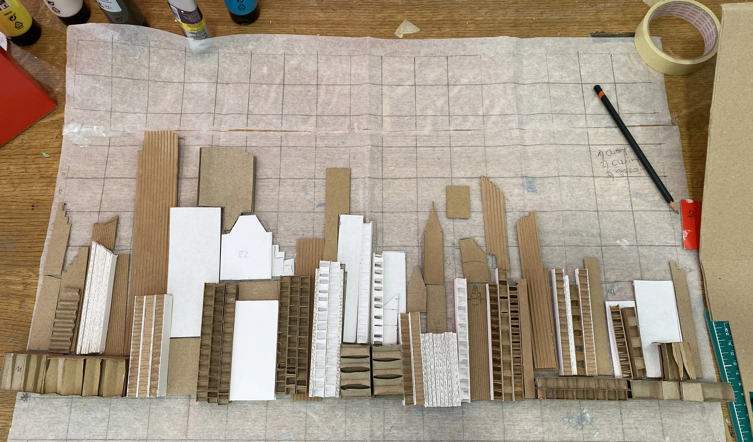 Step 1: Grösse bestimmen, Vorlage umrechnen und auf Papier planen. Dann die Gebäude zuschneiden und anordnen.